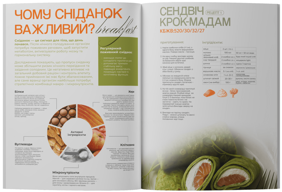Підбірка з 30 збалансованих рецептів сніданків: солоні, солодкі та вегетаріанські рецепти з покроковим описом процесу приготування та порахованими калоріями та КБЖВ. Додатково входять практичні поради по збору збалансованої тарілки.